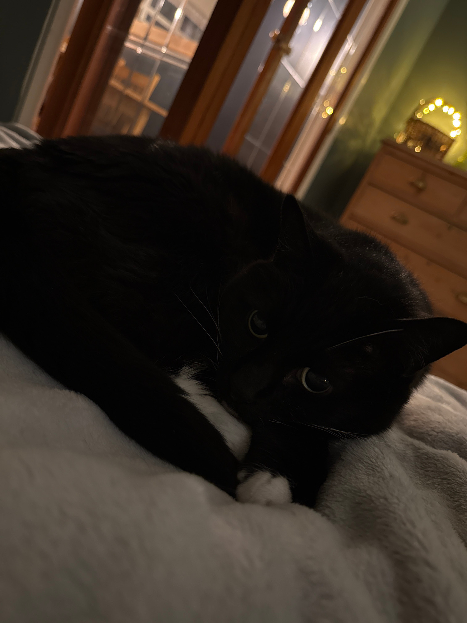 A black and white tuxedo cat is nestled on a grey, plush blanket. The cat is positioned in the upper right quadrant of the frame, with its head turned towards the camera. It has a white paw visible. I…read more