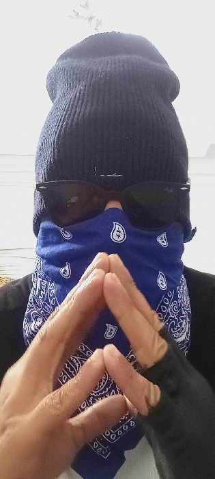 A person with a dark blue knit cap and dark glasses is facing forward. A blue bandana covers the lower face. A hand is in the foreground making a "W" sign with the fingers. The person is wearing a dar…read more
