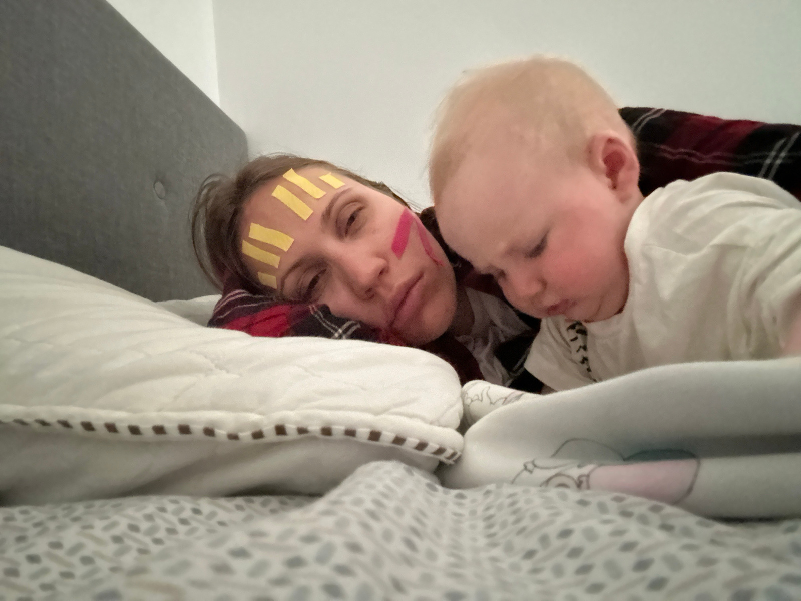 A woman and a baby are on a bed. The woman is lying on a white pillow with brown edges, and she has several yellow strips of tape on her forehead and a pink stripe on her cheek. She appears to be tire…read more