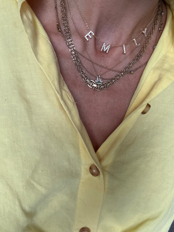 The image displays a close-up, high-angle view of an individual's upper chest and neck, set in Dubai, United Arab Emirates. The person exhibits fair skin and is wearing a light yellow, likely linen-bl…read more