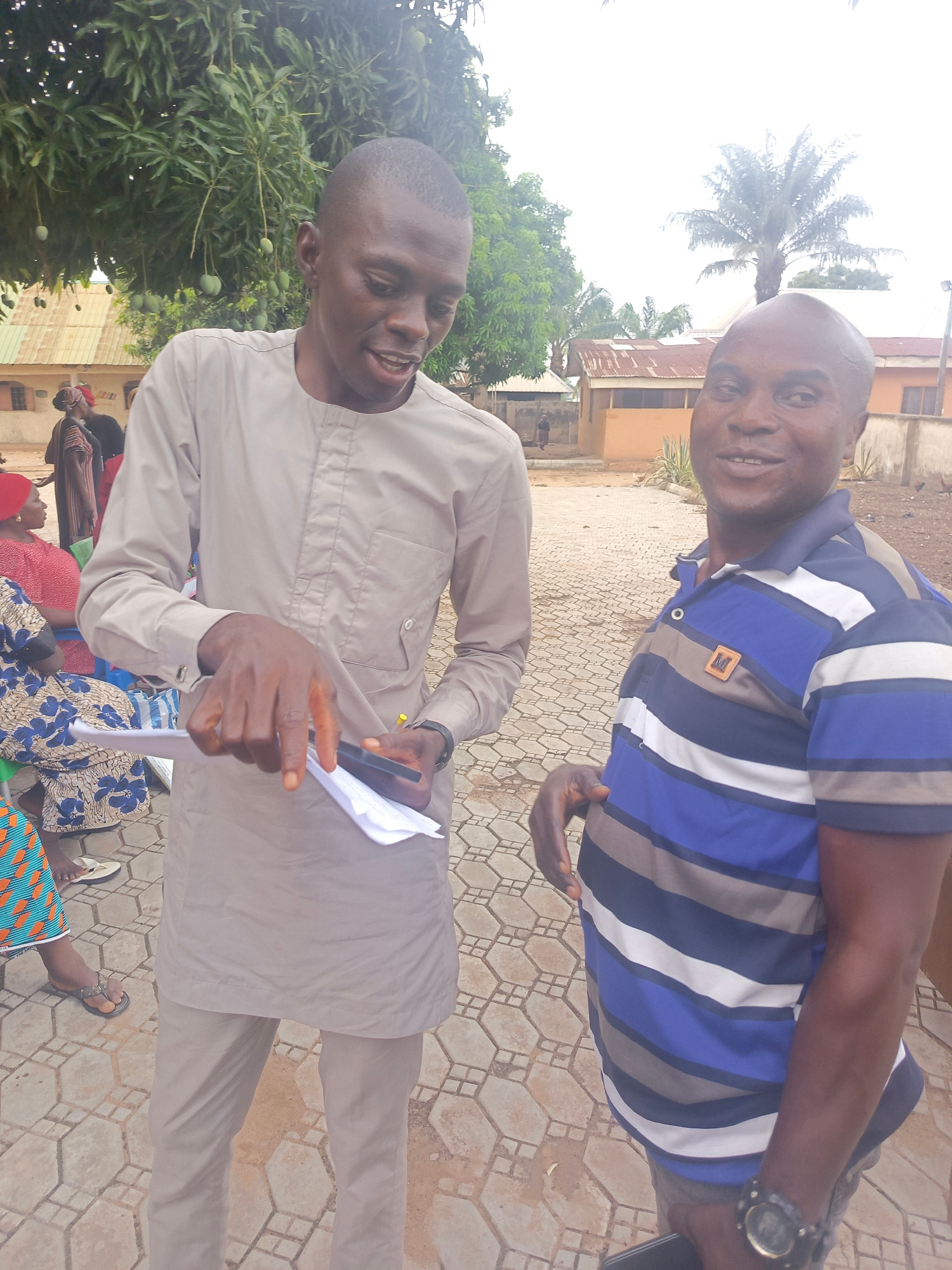 Two men are standing in an outdoor area paved with hexagonal bricks. The man on the left is wearing a gray, long-sleeved, button-down shirt and matching pants. He is holding papers and a black object,…read more