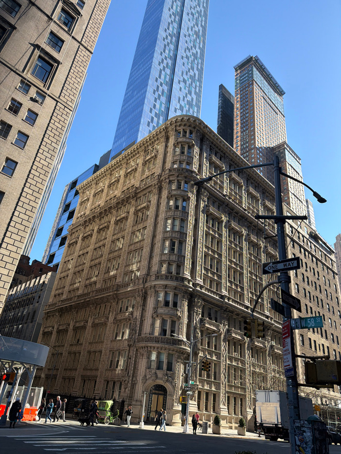 The image depicts an urban street scene in Midtown Manhattan, New York City, United States of America, captured on a clear, sunny day with a bright blue sky and prominent shadows. The perspective look…read more