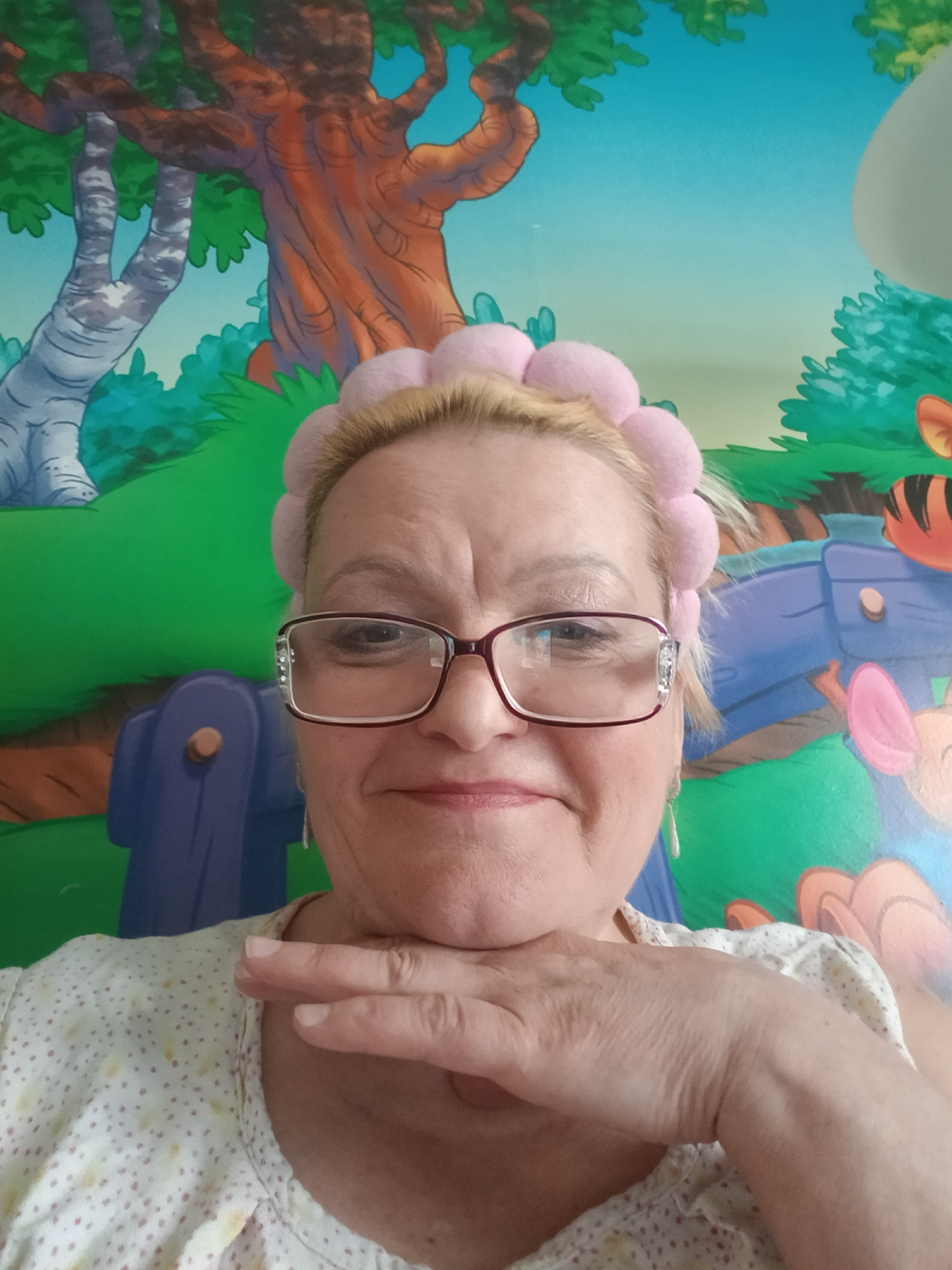 A woman with blonde hair and glasses is posing for a selfie in front of a wall mural depicting a cartoon forest. She is wearing a pink headband and a white top with yellow polka dots. Her left hand is…read more
