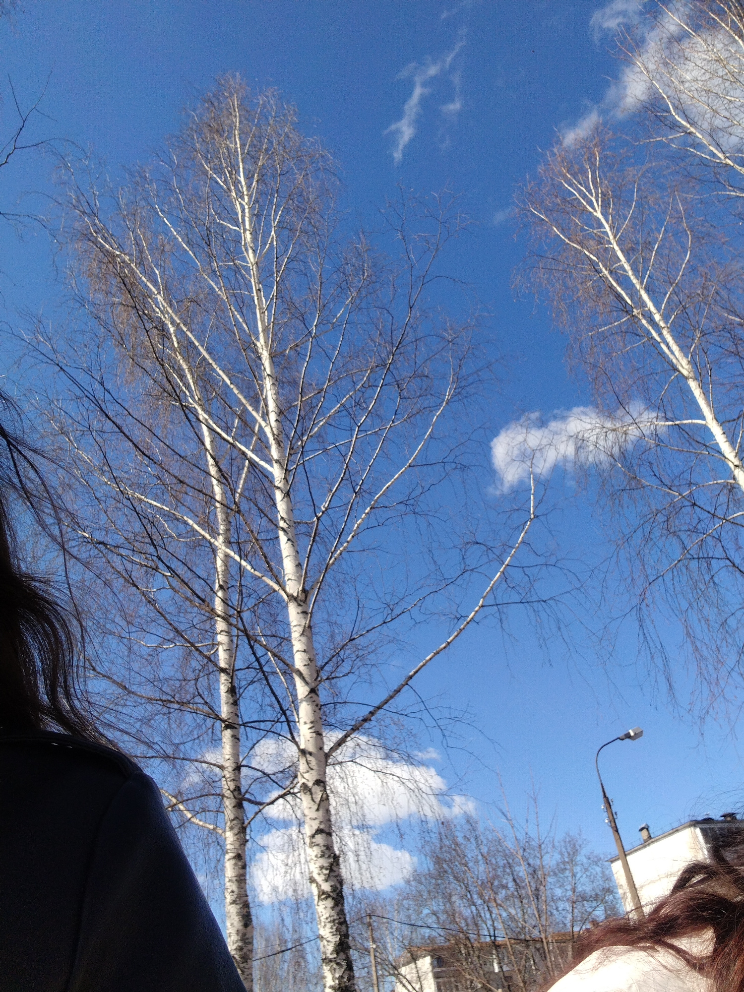 The image depicts a partially obscured view of a city street in Noviy, Russia. Two birch trees with bare branches dominate the midground against a bright blue sky with scattered white clouds. The loweβ¦read more
