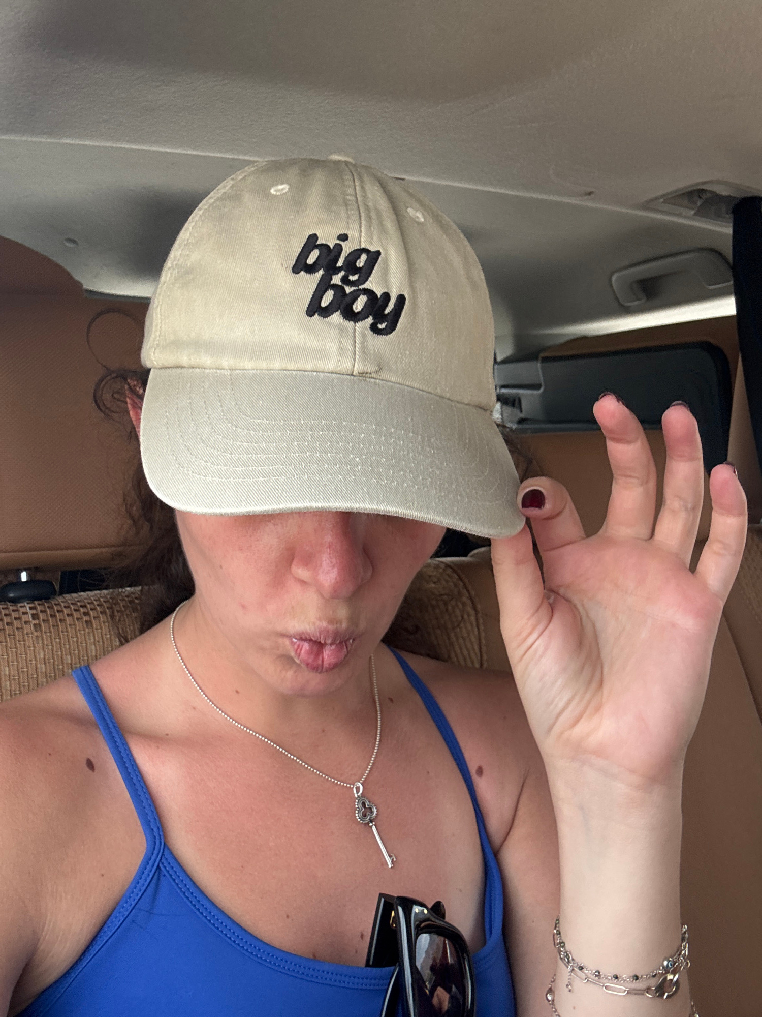 A woman in a bright blue swimsuit and a tan "big boy" baseball cap is in an unknown location in the United Arab Emirates. She is positioned within a vehicle; the interior walls and seats appear to be…read more
