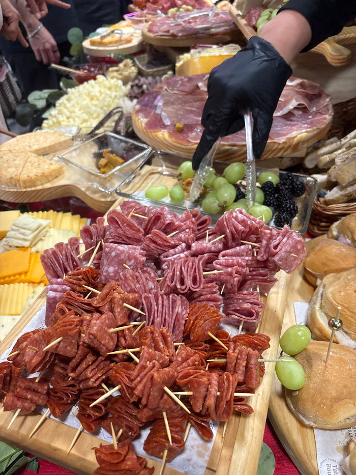 The image displays an elaborate charcuterie and cheese buffet setup, likely situated indoors at an event in Mexico City, Mexico. In the immediate foreground, a wooden serving board lined with white pa…read more