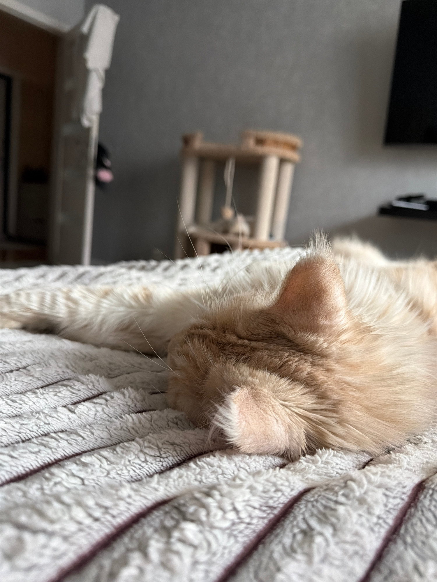 A close-up shot focuses on the head of a light orange cat resting on a soft, textured blanket with vertical stripes. The cat's ear is prominent. In the blurred background, there's a light-colored wood…read more