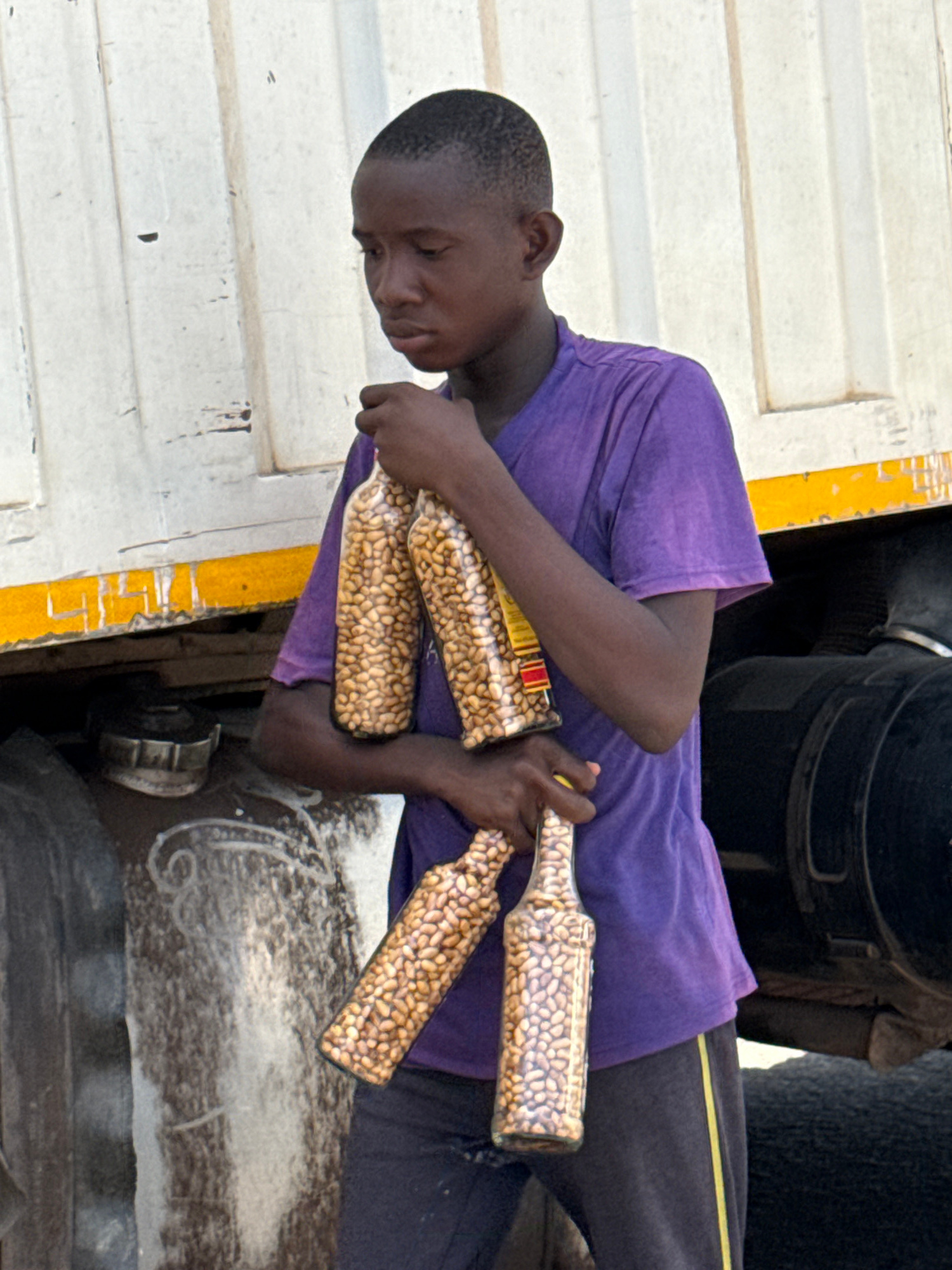 In Lekki, Nigeria, a young man, likely a vendor, stands on what appears to be a loading dock near a vehicle. He holds three glass bottles filled with peanuts. He wears a purple t-shirt and dark-colore…read more