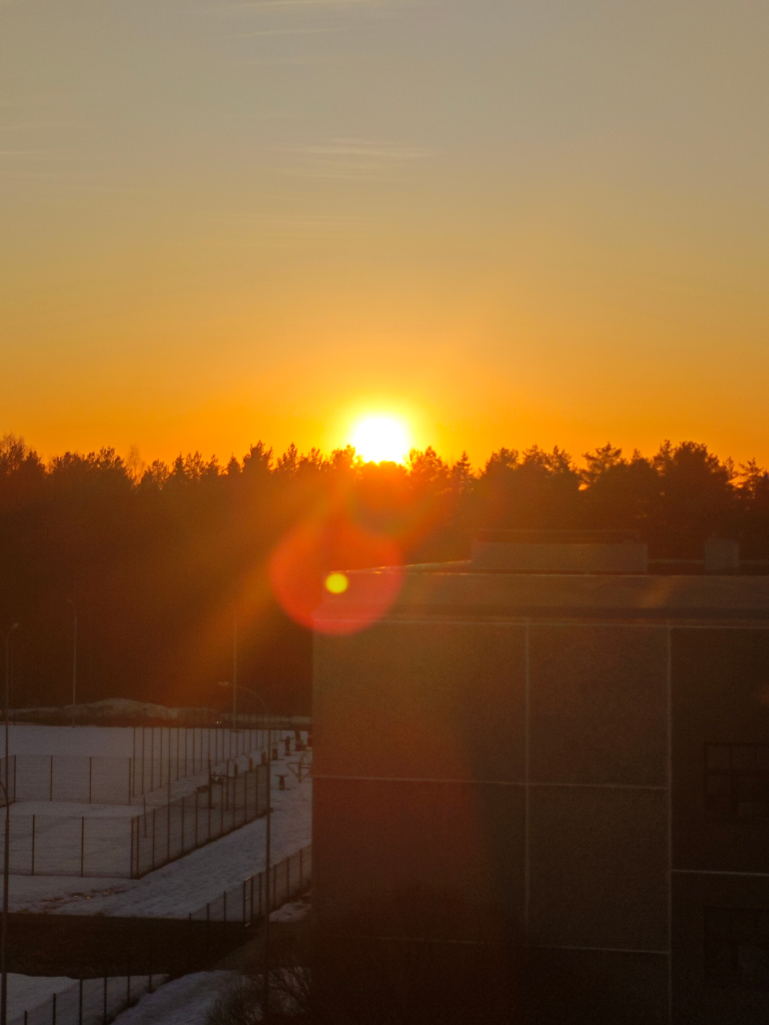 The image captures a sunset scene, possibly in Markovskii, Russia. A bright sun is centered, just above a dense line of silhouetted trees in the middle of the frame. An orange-yellow hue dominates theβ¦read more