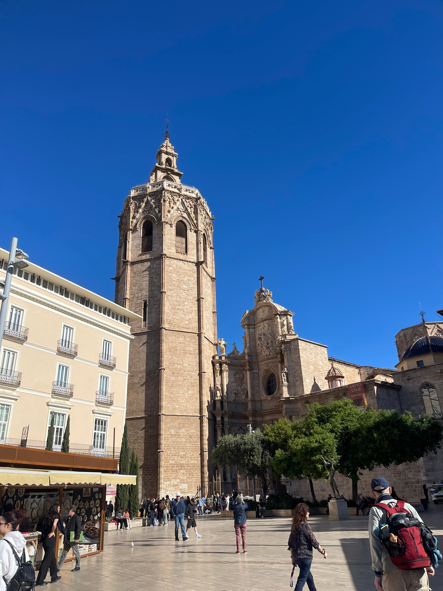 The image depicts the Micalet bell tower and Valencia Cathedral complex in Valencia, Spain, under a clear blue sky. The stone bell tower rises prominently, connected to adjacent buildings. Below, a pl…read more