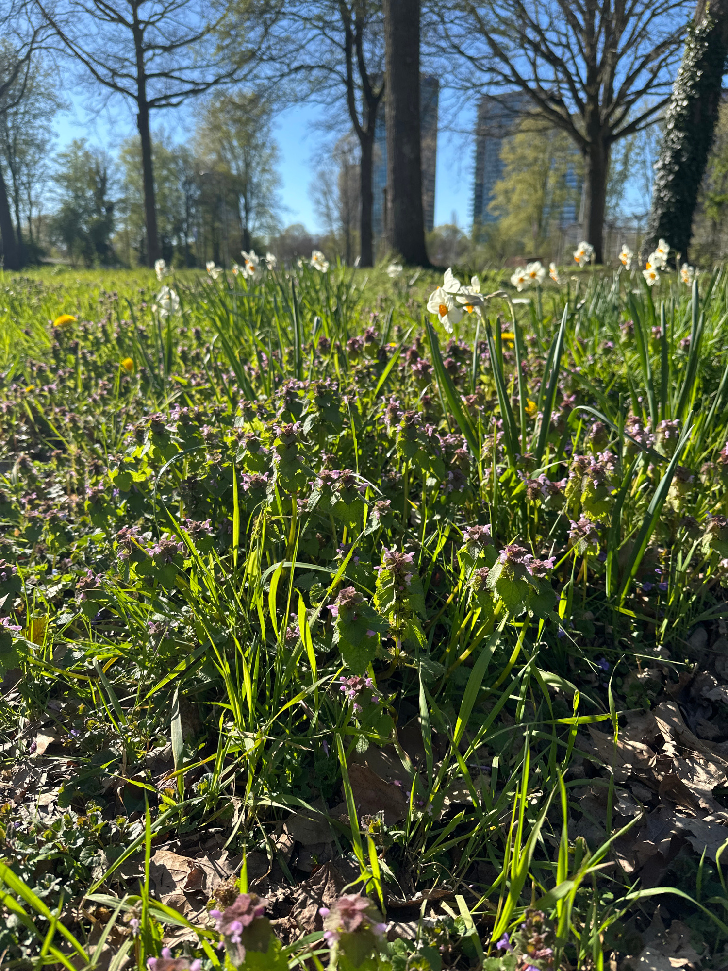 The image shows a ground-level view of a park in Amsterdam, Netherlands during spring. The foreground is filled with a mixture of lush green grass, purple dead-nettle flowers, and white narcissus blos…read more