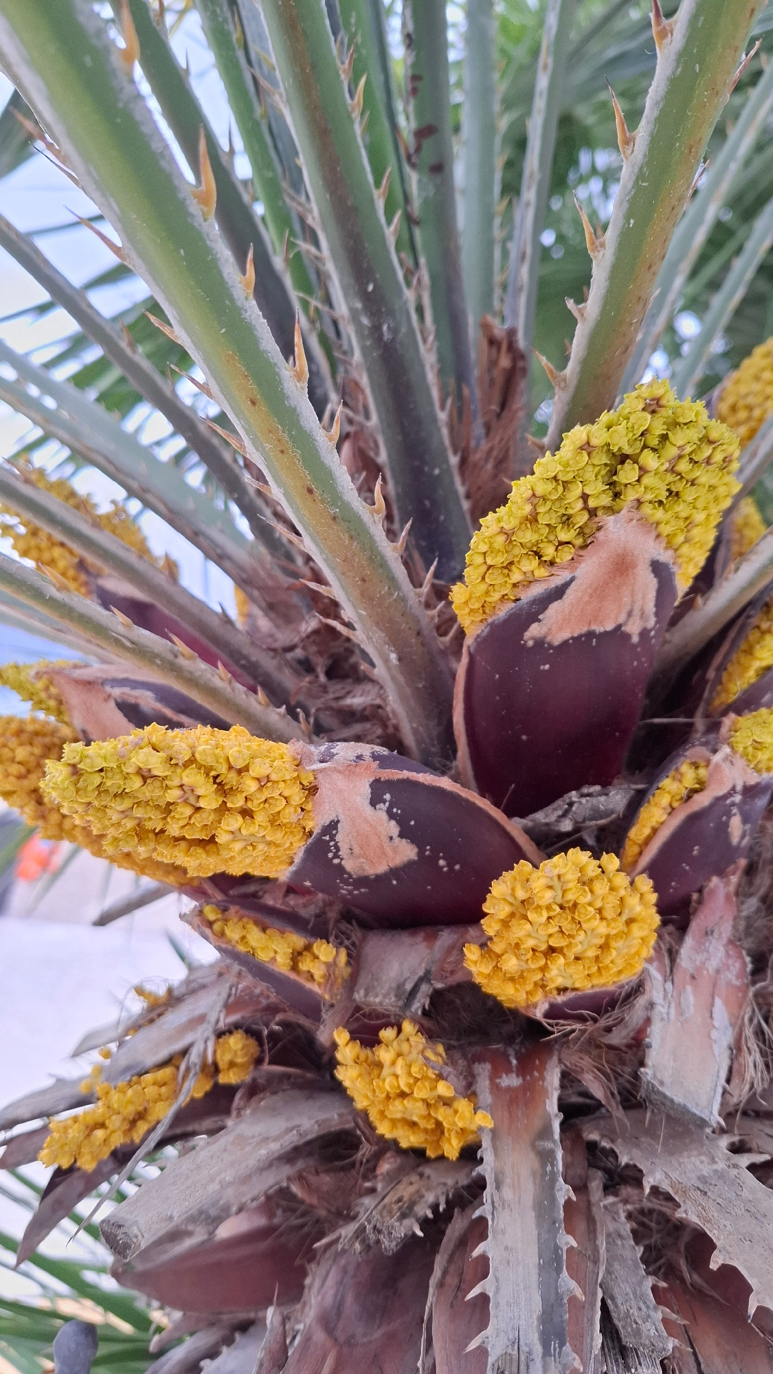 The image captures a close-up, upward-angled view of a palm tree. The tree displays spiky green fronds, alongside clusters of yellow flowers. The flowers emerge from dark brown bracts that have lighte…read more