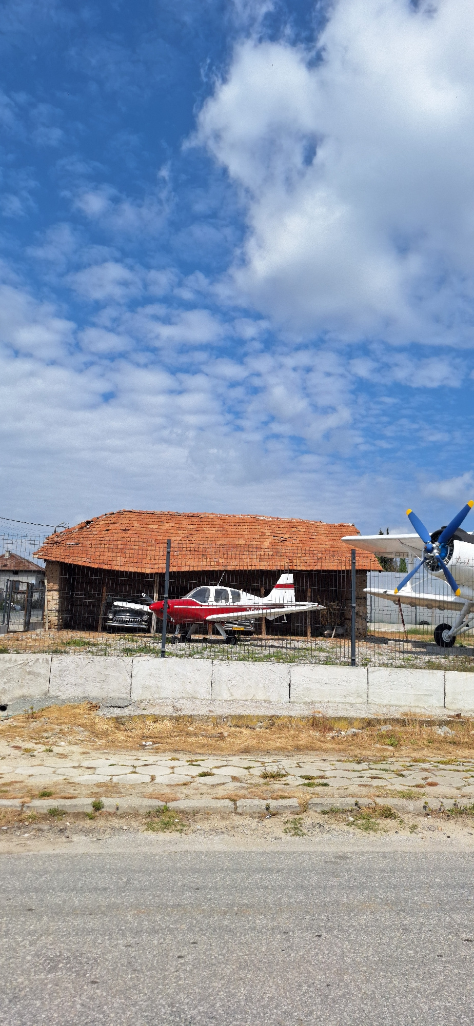 The image depicts two airplanes parked behind a chain-link fence in Kapatovo, Bulgaria. A single-engine red and white airplane is located under a brick-roofed structure. Further along, another white a…read more