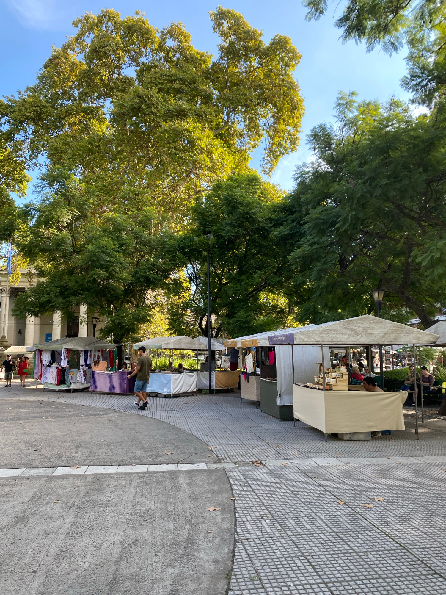 The image depicts a street market in Buenos Aires, Argentina. Vendors have set up stalls along a tiled walkway, displaying clothing and other goods for sale. A large, mature tree with green foliage isβ¦read more