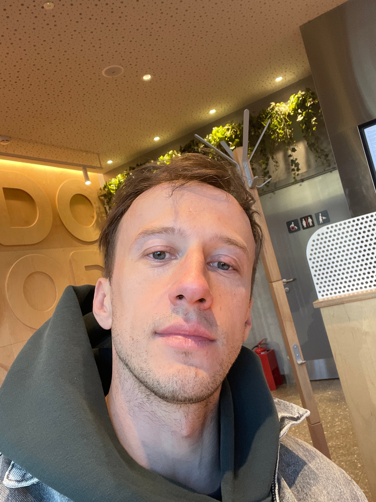An indoor, vertically oriented selfie captures a man from the chest up, looking directly at the camera with a neutral expression. He has short, light brown hair, blue-green eyes, and light stubble on…read more