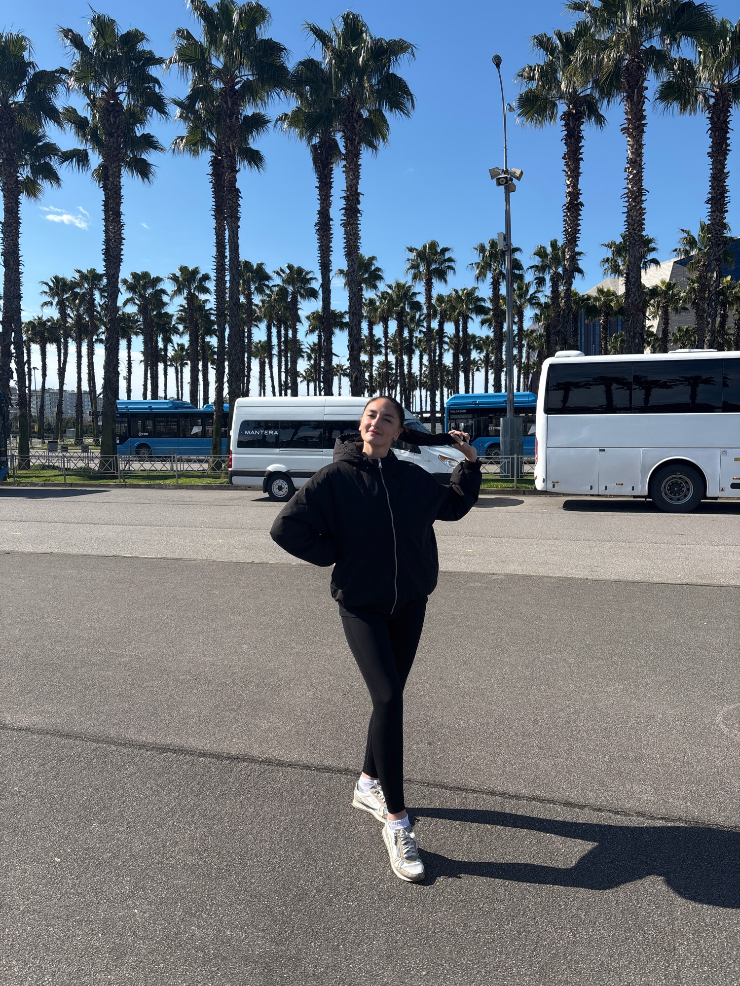 A person in a black jacket and leggings stands on an asphalt surface, casting a shadow to their right. Palm trees line the left side of the frame under a clear blue sky. Several buses, colored white a…read more