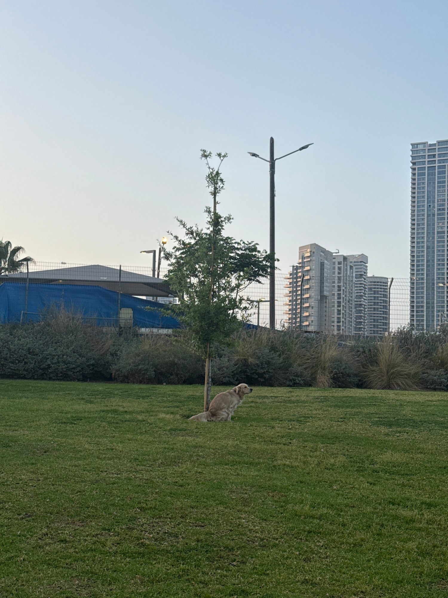This media file captures an outdoor urban park scene, likely in Tel-Aviv, Israel. The image is dominated by a large expanse of vibrant green grass covering the foreground and extending into the midgro…read more