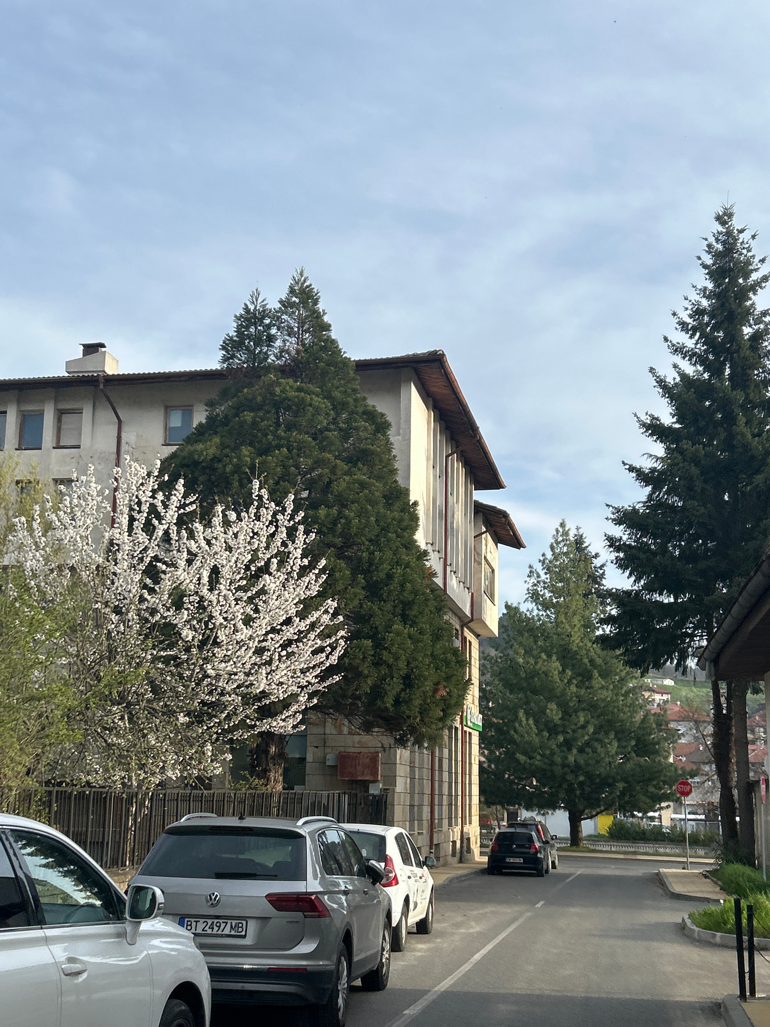 The image, taken in Zlatograd, Bulgaria, shows a daytime street scene, likely in spring, given the prominent white blossoms. The photograph is oriented vertically, depicting a multi-story building on…read more