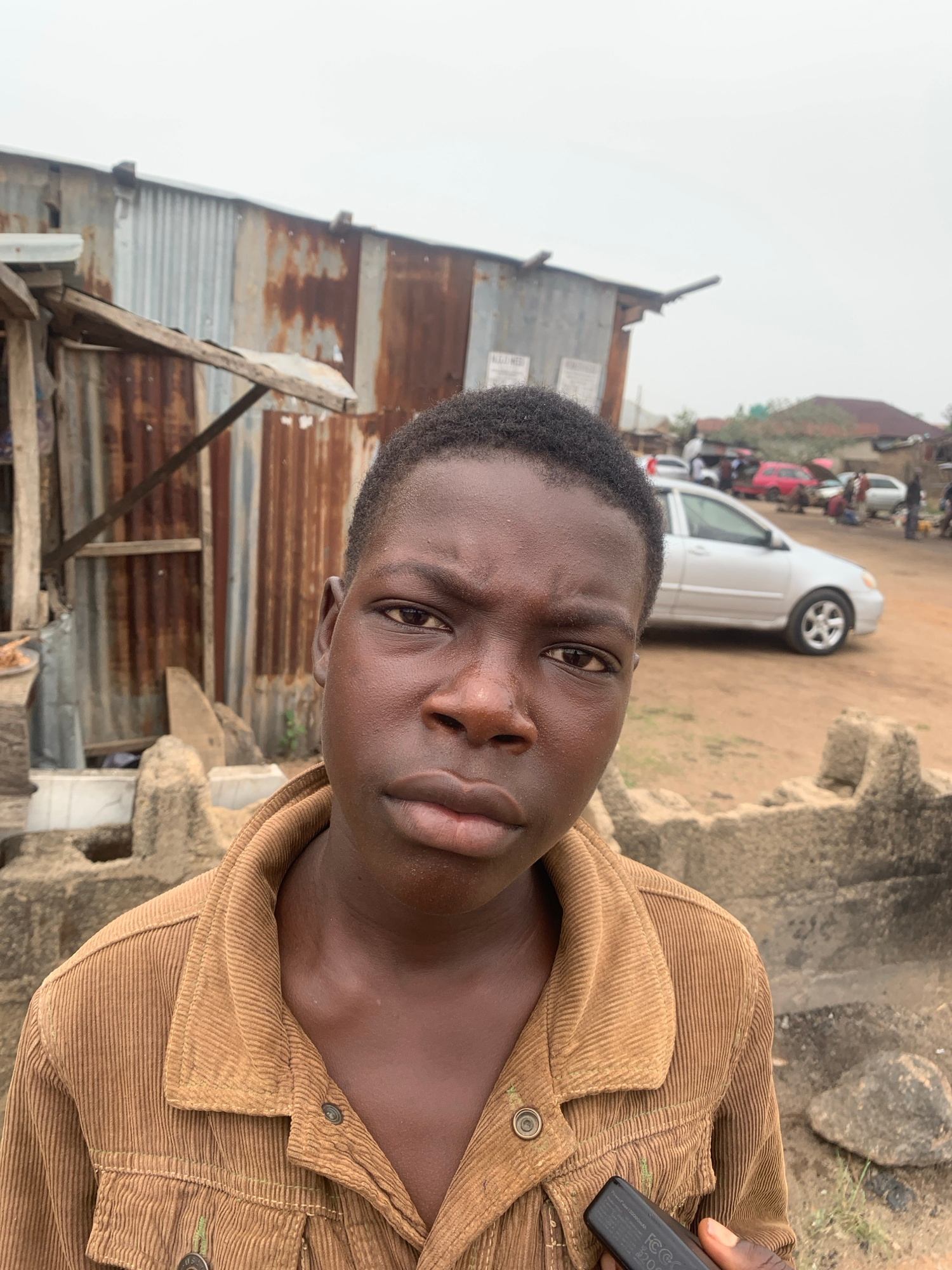 A young, dark-skinned male is closely framed in the foreground, wearing a brown corduroy jacket. He holds a black device in his hand, partially out of frame. The background shows a corrugated metal st…read more