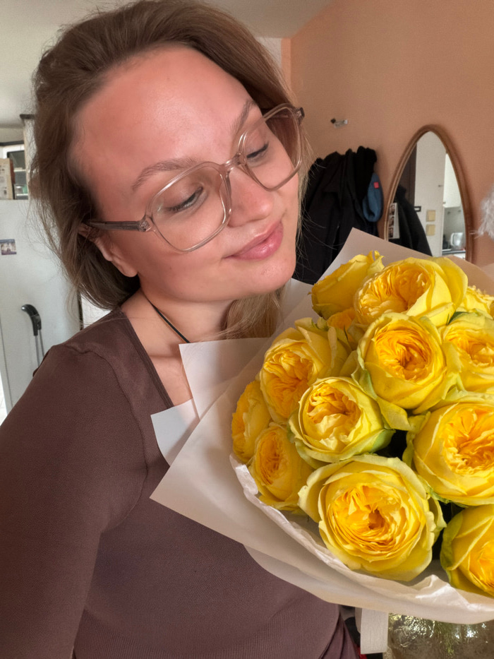 A female individual with blonde hair and clear-framed eyeglasses is depicted indoors in a residential setting in Tel Aviv-Yafo, Israel. She wears a dark brown top and a thin dark necklace. Her eyes ar…read more
