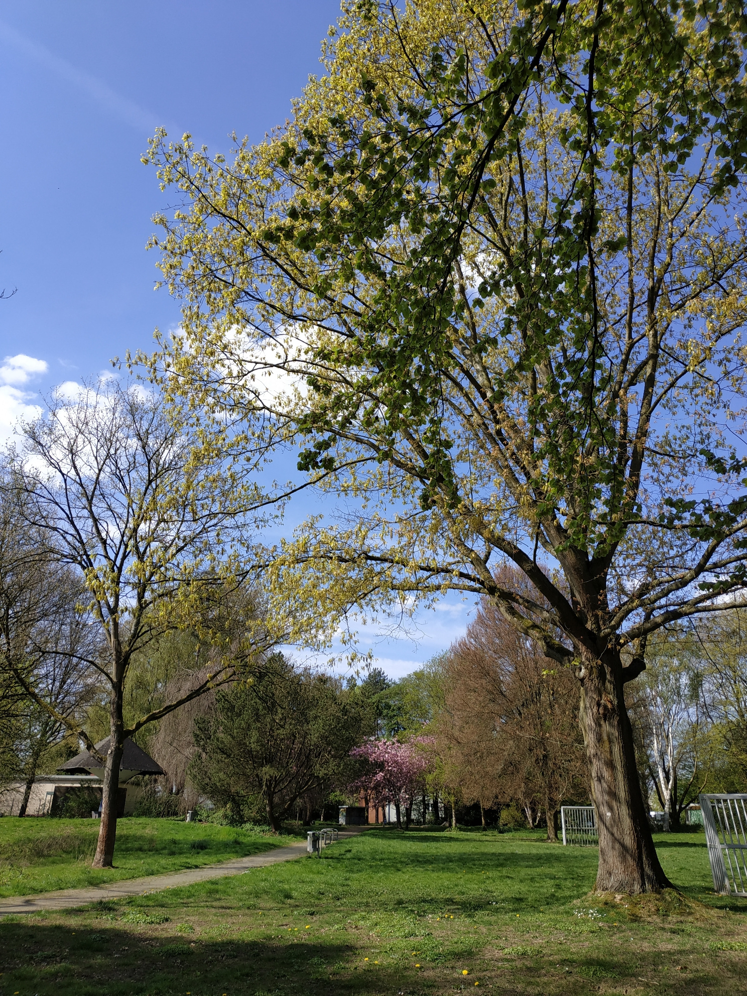 The image shows a tree-lined path in a park in Dortmund, Germany, on a sunny day. The sky is blue with scattered white clouds. Two large trees dominate the view, with branches and leaves overhead. A g…read more