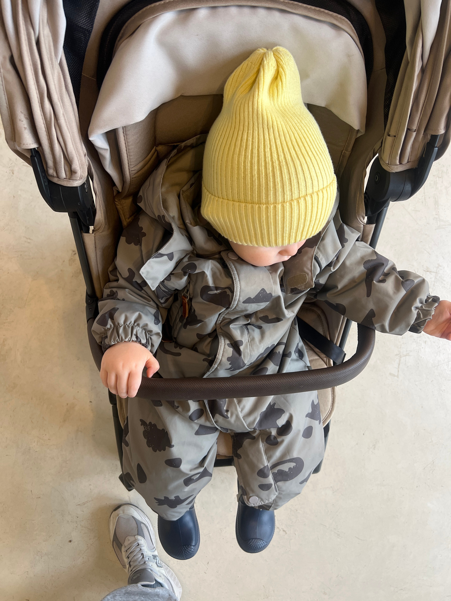 A top-down, overhead view captures a baby or toddler dressed in warm attire, seated in a beige and black stroller. The child wears a bright yellow, ribbed knitted beanie that covers their head, and a…read more