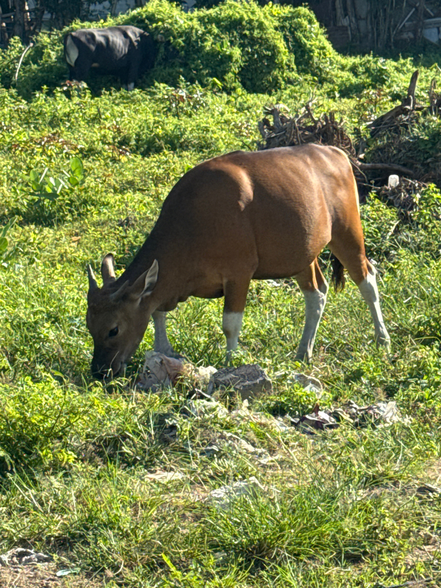 A brown bovine animal, likely a Bali cattle (Bos javanicus domesticus) or Banteng, stands prominently on a vibrant green grassy slope. The animal has a smooth, reddish-brown coat with distinct white m…read more