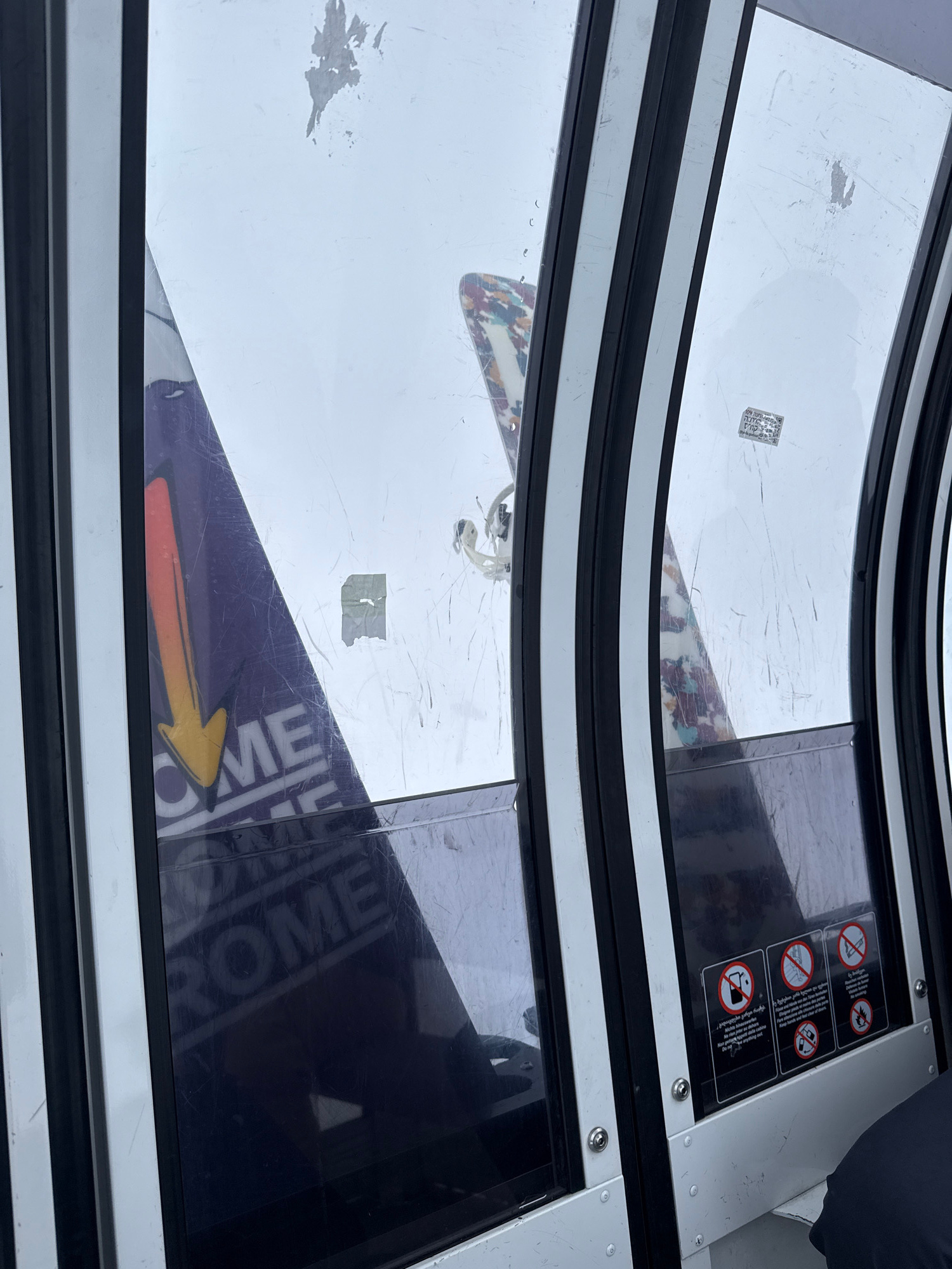 The image shows the interior of a gondola car, possibly a ski lift, in what may be Gudauri, Georgia. Through the curved glass panels, a partial view of a snowboard is visible. The snowboard features a…read more