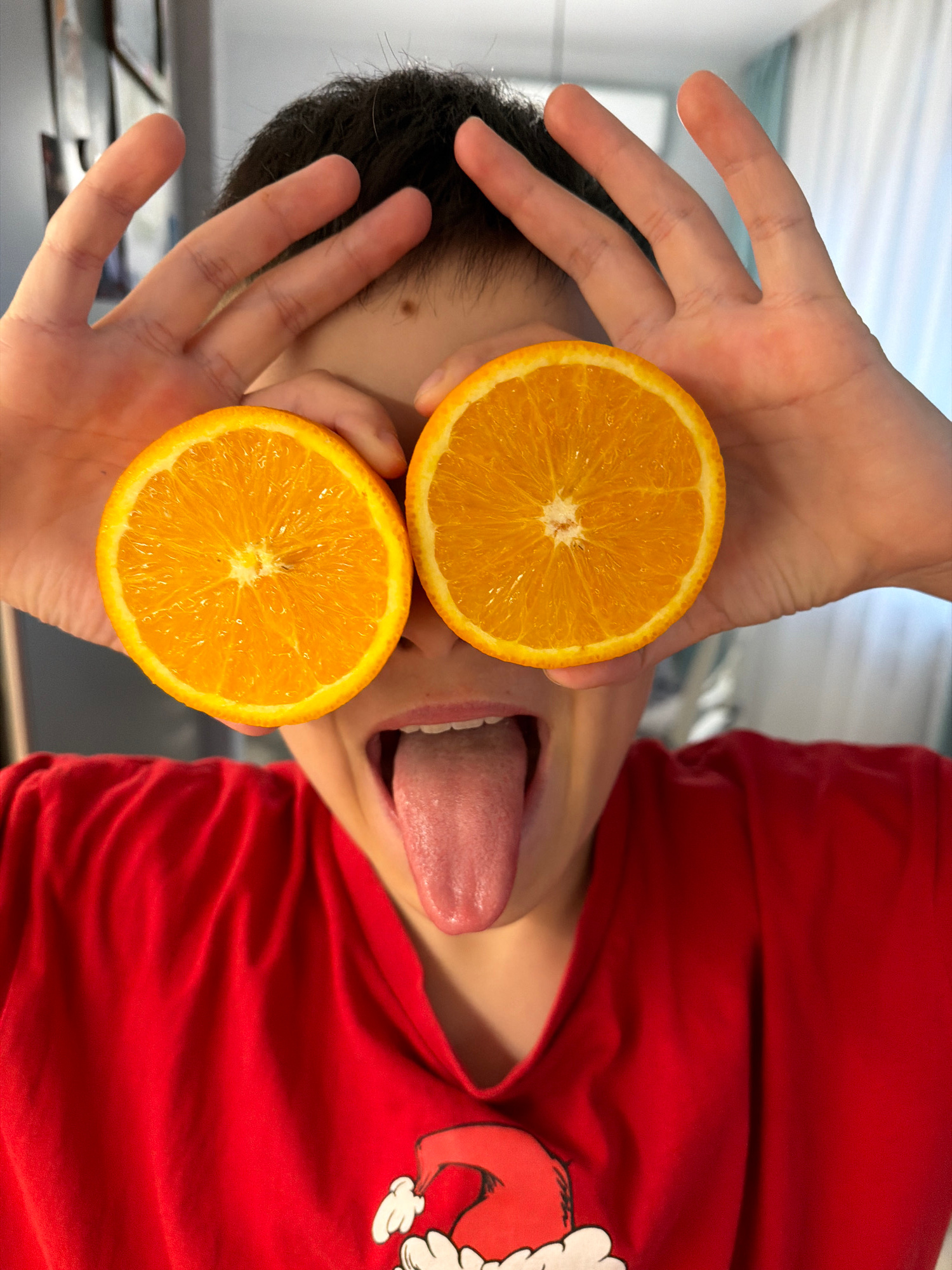 A person wearing a red shirt with a white graphic is holding two orange halves in front of their face, with their tongue sticking out between the orange slices. The person's hands are visible, framing…read more