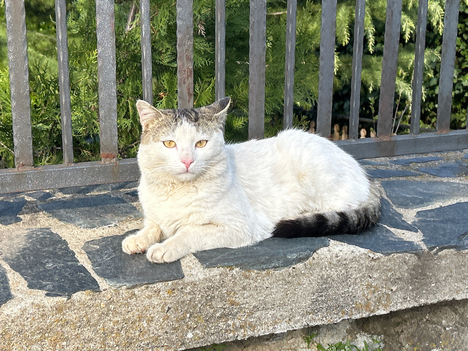 A white cat with a black and gray tail rests on a stone wall in Kuklen, Bulgaria. The cat has yellow eyes, a pink nose, and some gray markings on its head. Behind the wall is a metal fence and green f…read more