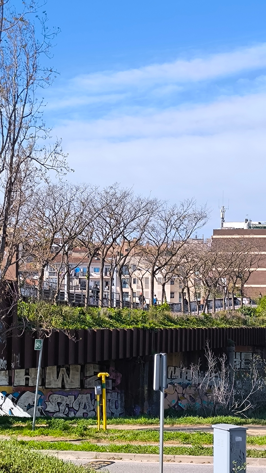 The image depicts a street scene in Ripollet, Spain. A corrugated metal retaining wall supports an elevated walkway or path, which is lined with trees lacking foliage. Graffiti covers the retaining wa…read more