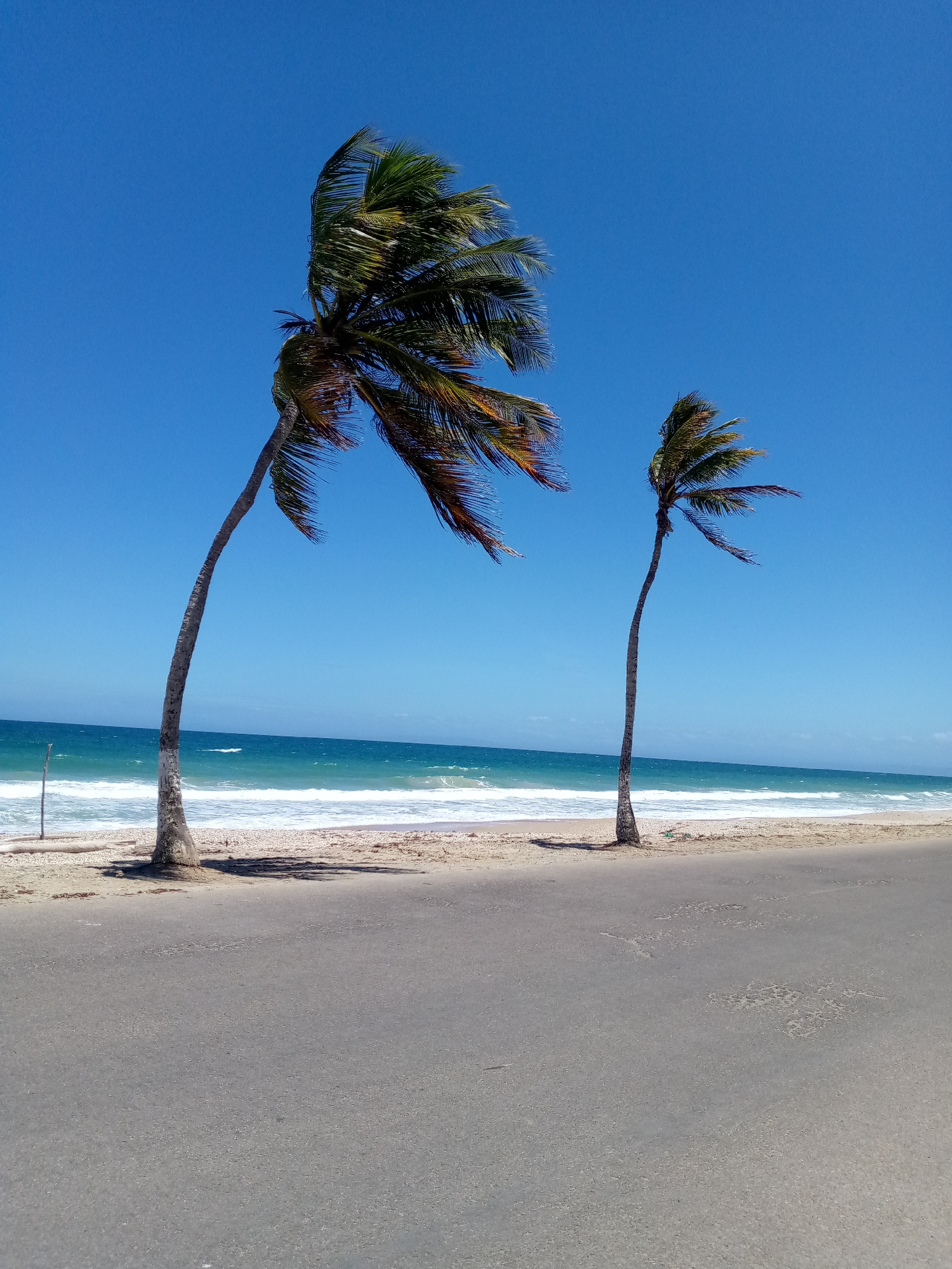 The image displays a bright, clear daytime coastal scene in Porlamar, Venezuela. The foreground consists of a grey asphalt road, granular in texture and devoid of markings or vehicles. Beyond the road…read more
