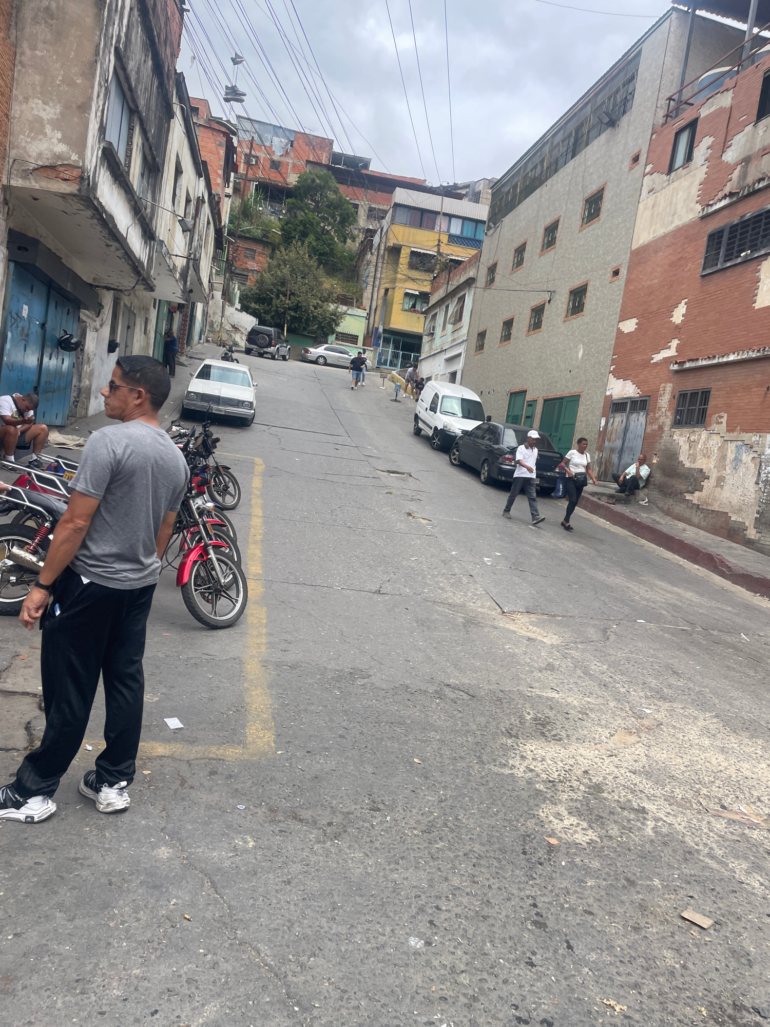 The image shows a street scene in Caracas, Venezuela. In the foreground, a man in a gray shirt and black pants stands beside several motorcycles parked on the street. The street is paved with cracked…read more