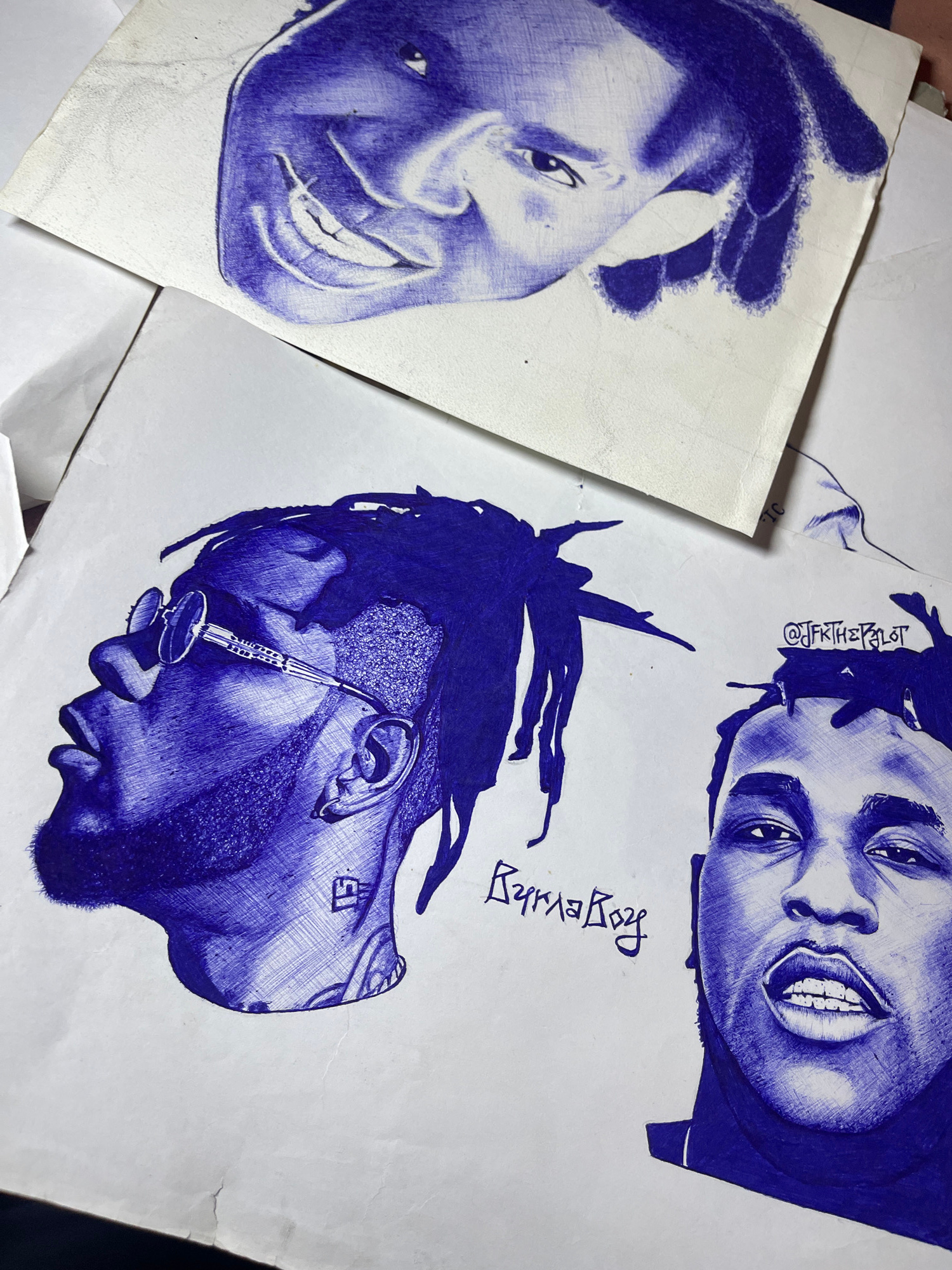 The image contains three pen-drawn portraits in blue ink on white paper. The portrait on the left depicts a smiling man with dreadlocks. The top right portrait also features a smiling man with dreadlo…read more