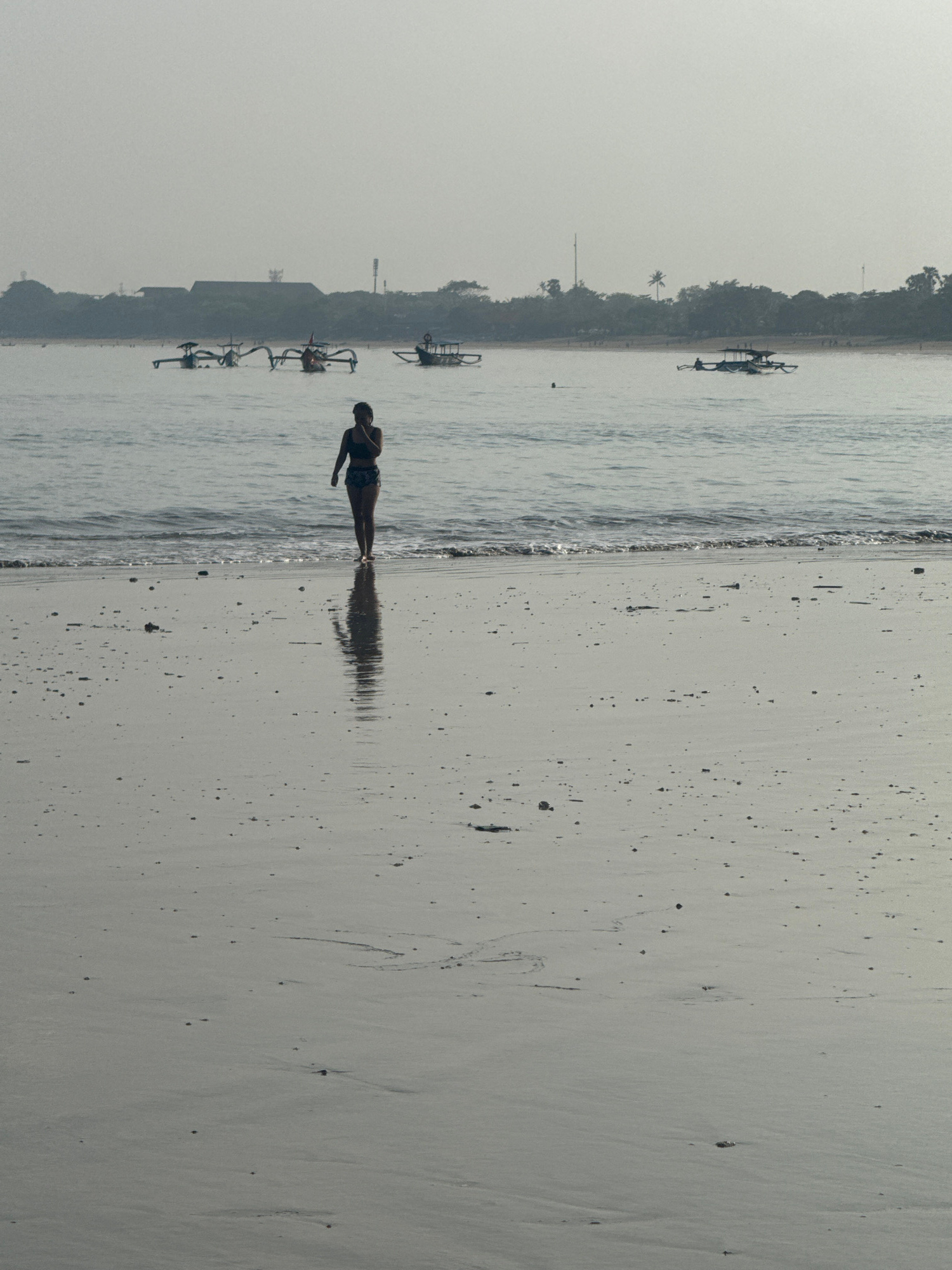 The scene depicts a beach landscape in Jimbaran, Indonesia. A body of water borders the shoreline, and a person is standing in the water near the edge of the beach. The person appears to be reflected…read more