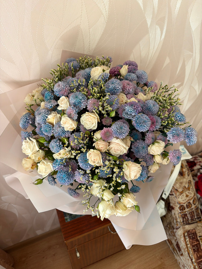 A large, voluminous bouquet of flowers, primarily composed of small, spherical blue and purple chrysanthemums, is centrally positioned. Numerous cream-colored and light pink roses, some fully open and…read more