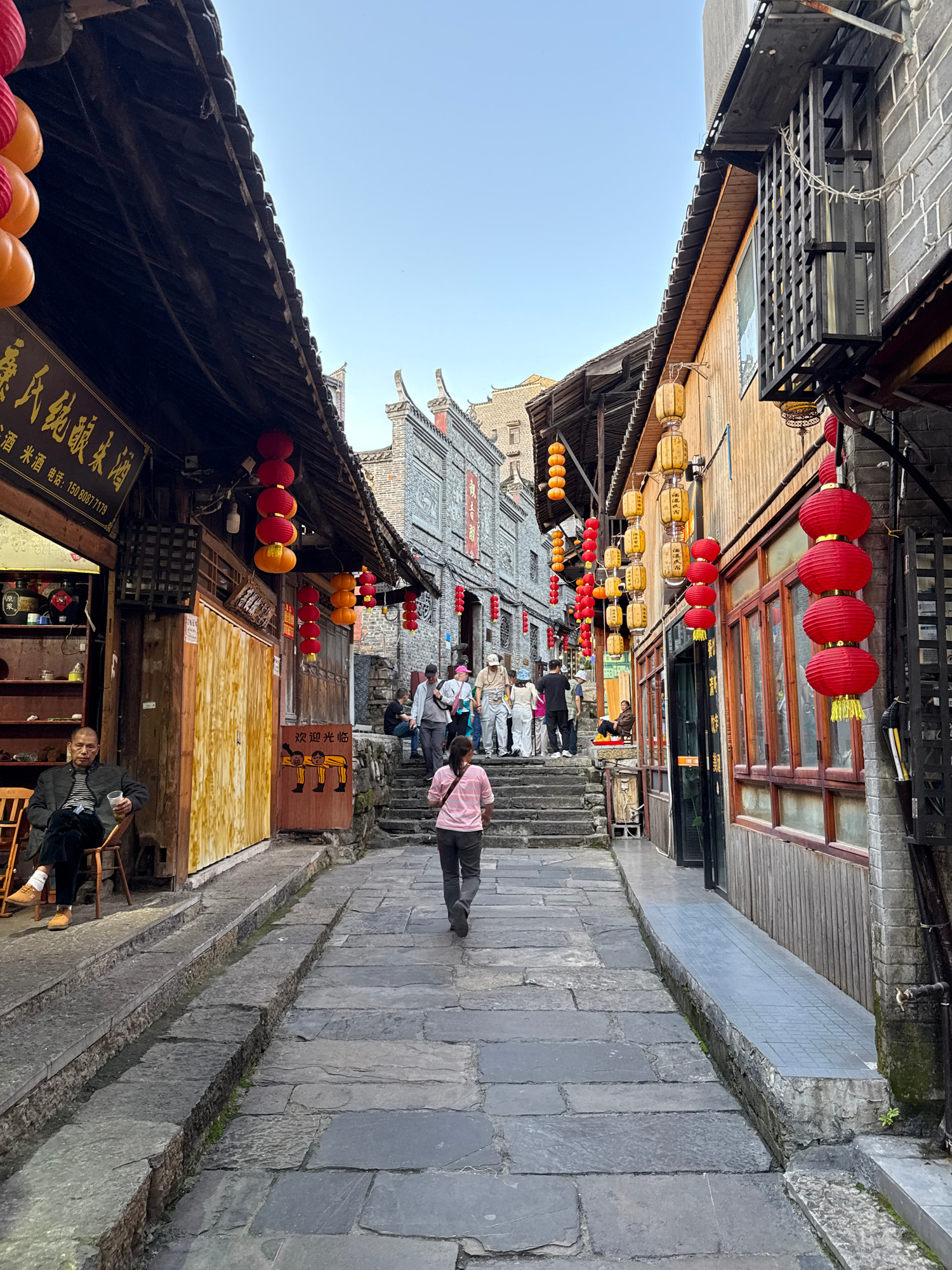 The image depicts a narrow, stone-paved street in Furong, China. Red and yellow lanterns are strung above, lining the street. Traditional Chinese buildings flank the street, with intricate wooden stru…read more