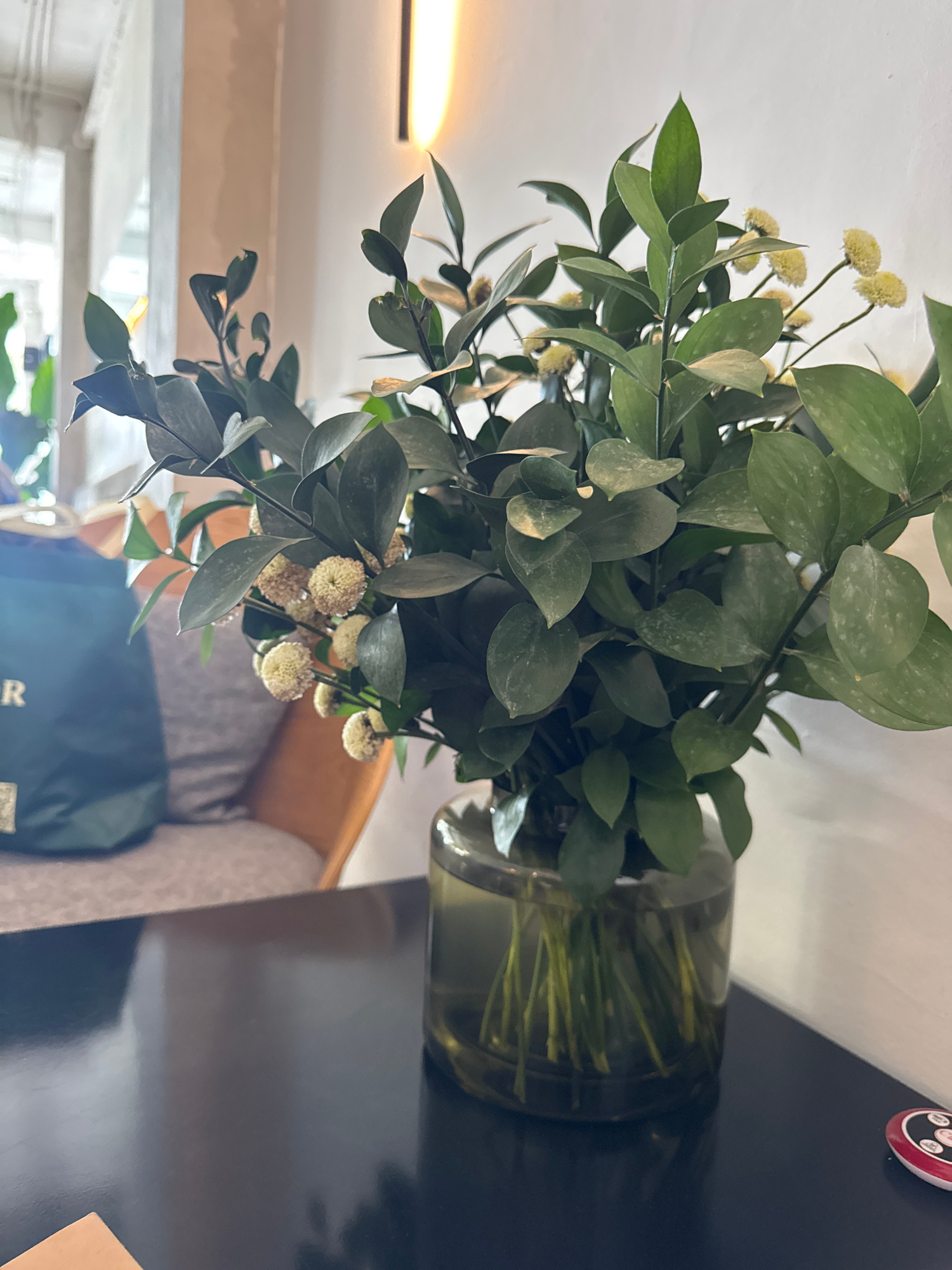 A vase of greenery and small, round, cream-colored flowers sits on a dark surface. The photo was likely taken indoors during the day. The environment suggests a casual setting. Based on the location,…read more