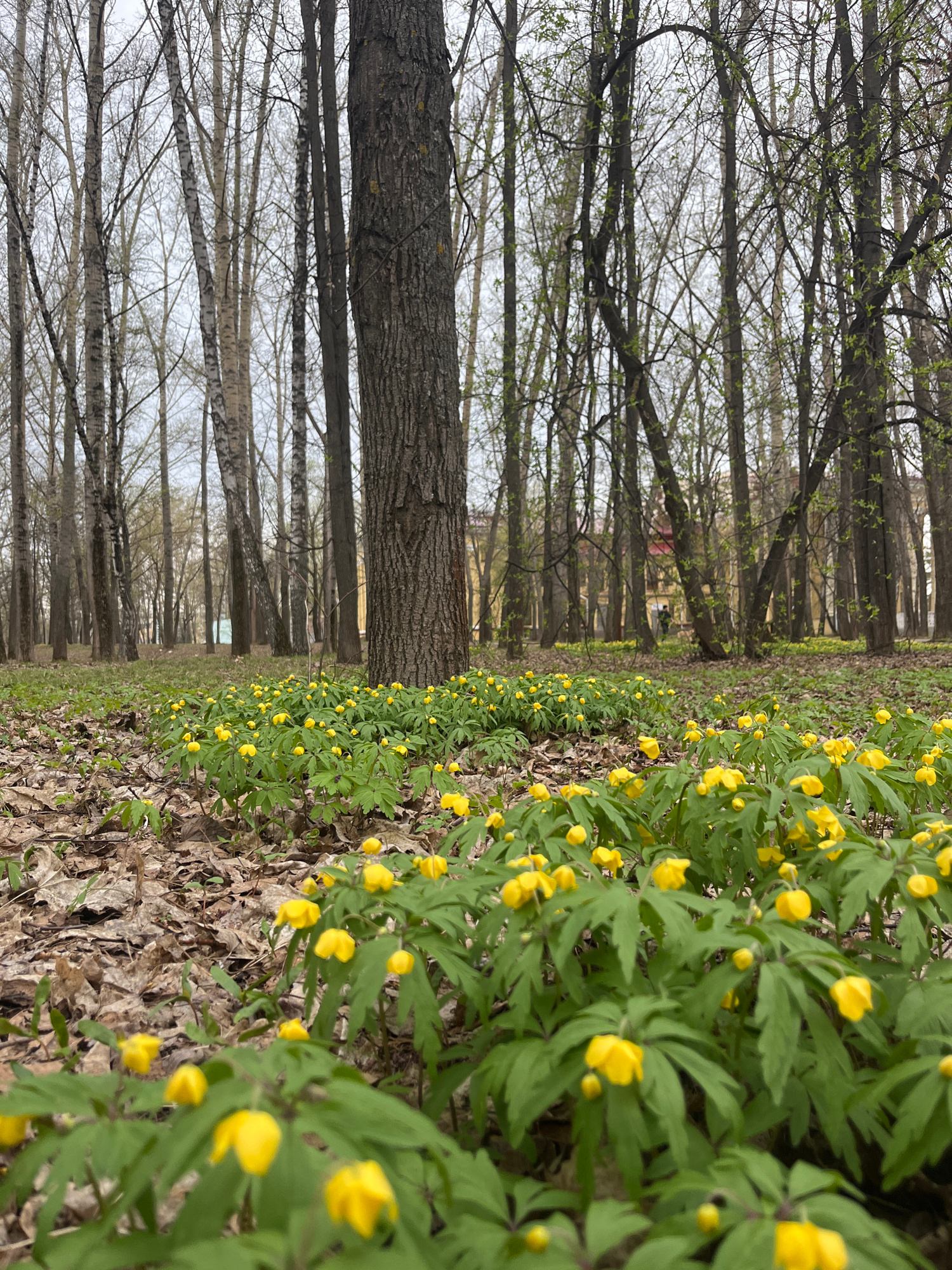 The image depicts an outdoor natural scene, likely a park or woodland path, bathed in soft, diffused light, characteristic of an overcast day in early spring. The perspective is low, looking forward a…read more