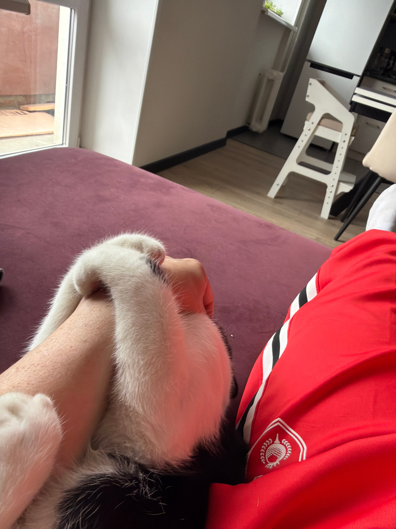 A close-up, low-angle shot shows a person wearing a red shirt with white and black stripes and a white logo of an acorn and leaves, possibly a sports team, holding a black and white cat. The person's…read more