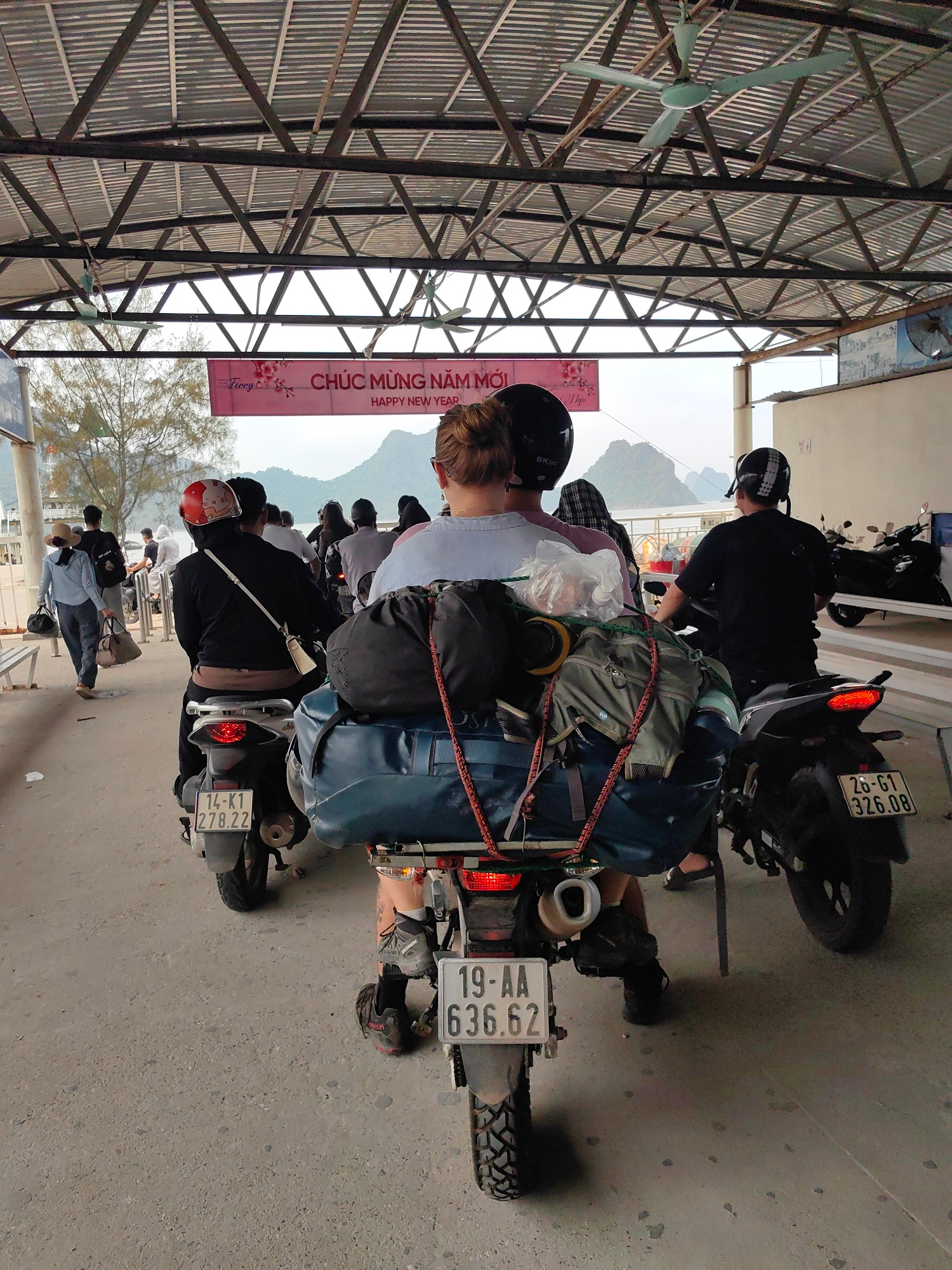 The image shows a group of people on motorcycles, presumably tourists, waiting in line at a ferry terminal. The terminal is located in the city of Hải Phòng, Vietnam. The motorcycles are loaded with l…read more