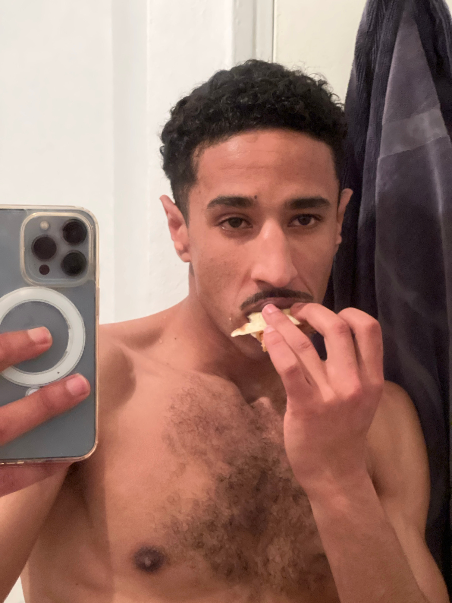 A shirtless man is taking a selfie in a bathroom, eating a piece of food. The man has short, dark curly hair, and facial hair. He is holding a phone with multiple lenses. A towel hangs in the backgrou…read more