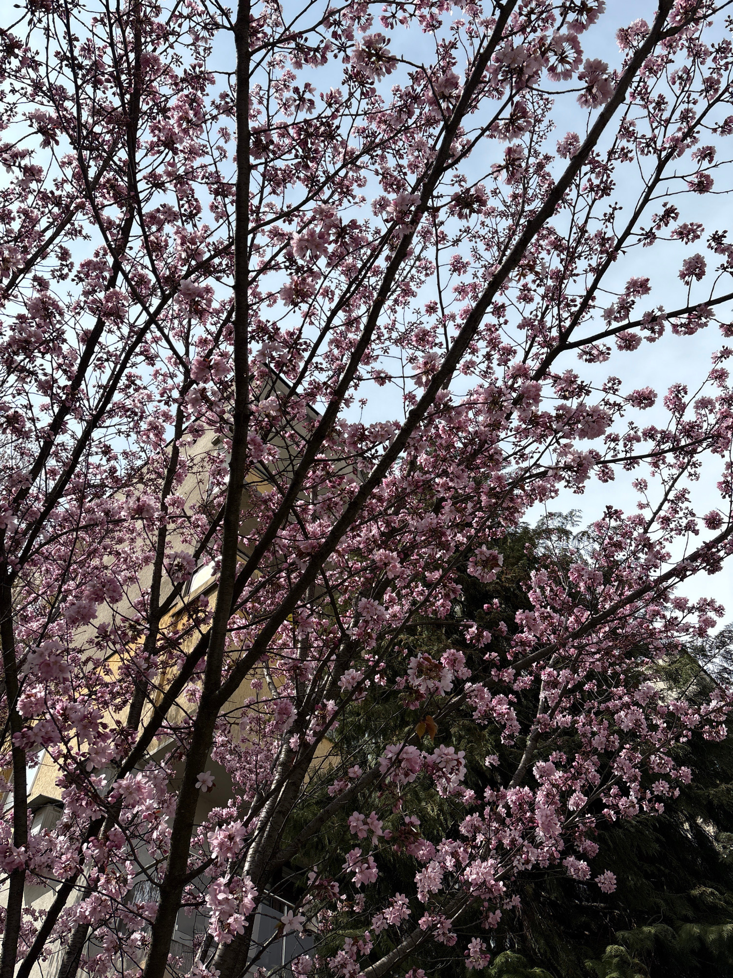 The image shows a low-angle view through the branches of a flowering tree with pink blossoms against a light blue sky. Part of a building with a light-colored facade is visible behind the branches. Th…read more
