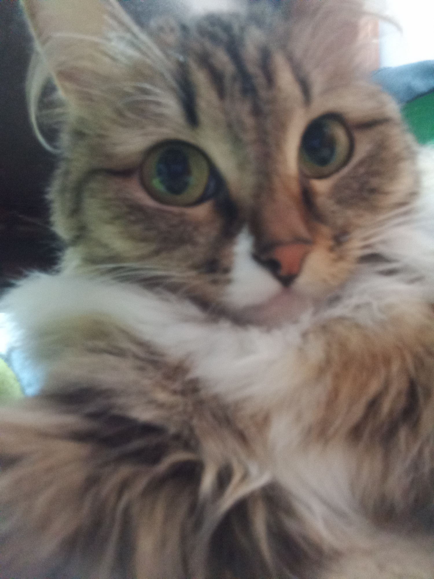 A close-up, slightly blurred image shows a cat with brown tabby markings on its head and face. The cat has striking green eyes with dark pupils. Its fur is a mix of brown, white, and cream, appearing…read more