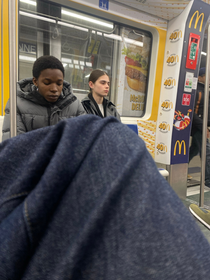 A blurry photo captures two passengers asleep on public transportation. The foreground is dominated by a large, out-of-focus blue denim item. Behind it, two people are resting. One wears a gray pufferβ¦read more