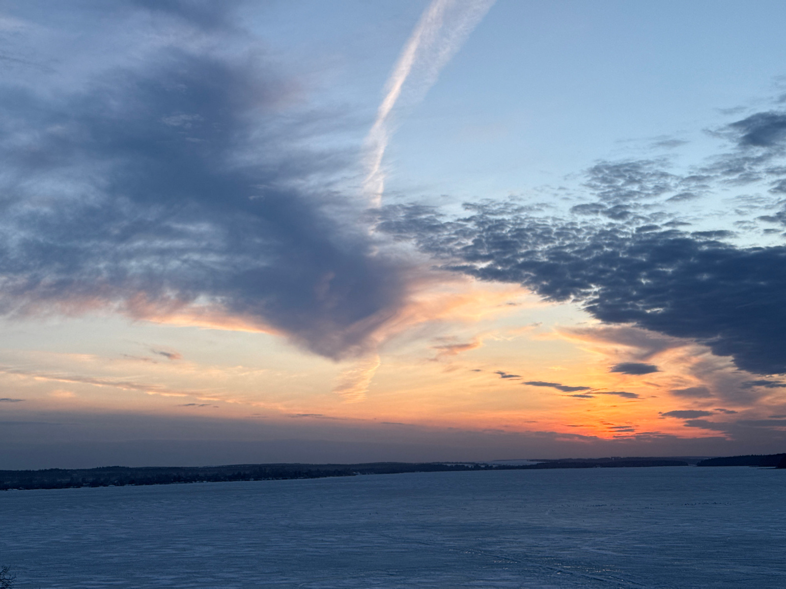 The image shows a sky with various cloud formations during a sunset or sunrise. The sky transitions from light blue at the bottom to orange and yellow hues near the horizon line. Darker, textured clou…read more