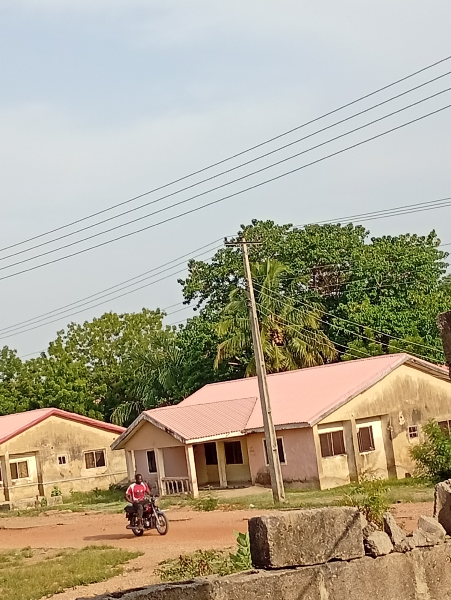 This daytime image depicts a residential scene in Adankolo, Nigeria, under a clear, pale blue sky. In the midground, a man wearing a red and white short-sleeved shirt and dark trousers is riding a darβ¦read more