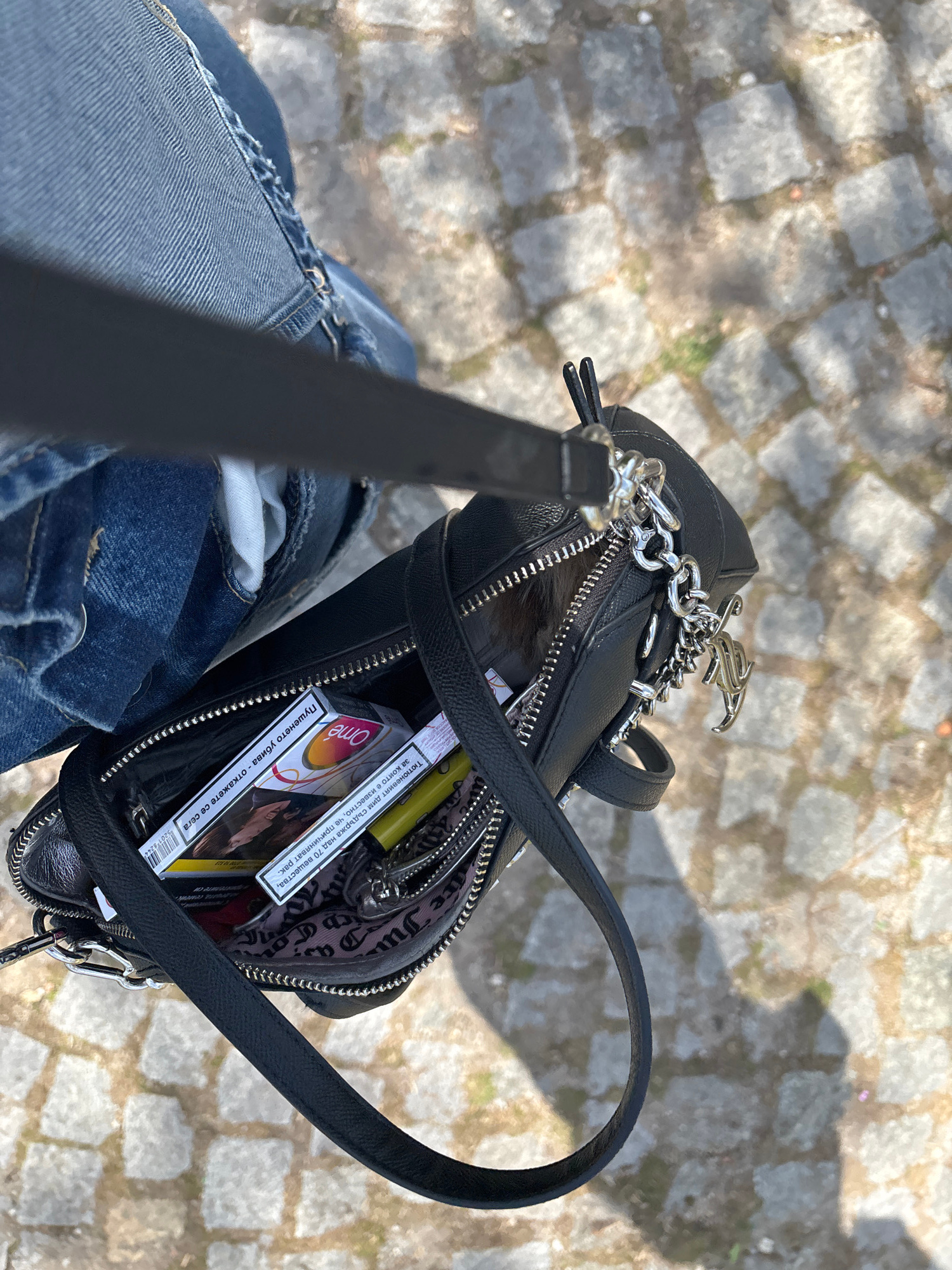 A close-up, high-angle shot captures the contents of an open black leather handbag, held by an individual wearing denim jeans, while standing on a cobblestone surface. The bright sunlight suggests day…read more