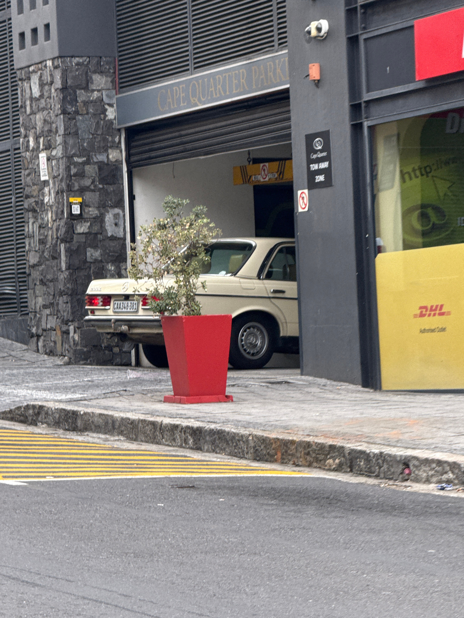 The image captures a scene at the Cape Quarter Park in Cape Town, South Africa. An older model, light-colored car with license plate "CAA348-381" is partially parked under a building overhang. The bui…read more
