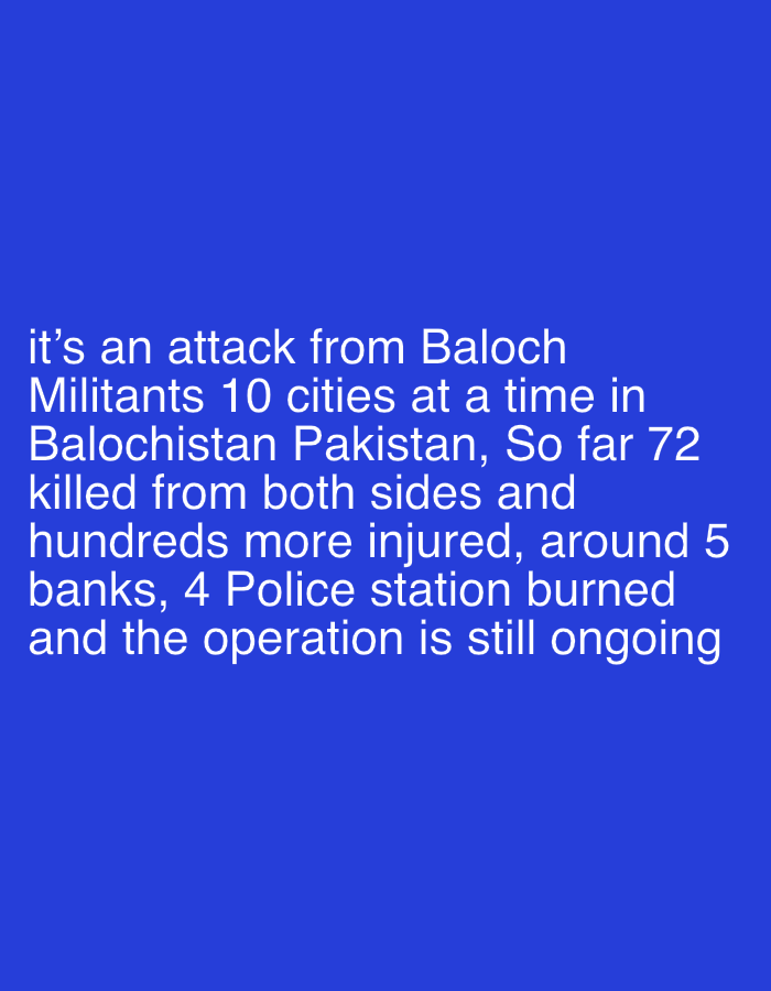The image contains text reporting an attack by Baloch militants in Balochistan, Pakistan. It states that ten cities were attacked simultaneously, resulting in 72 deaths from both sides and hundreds in…read more
